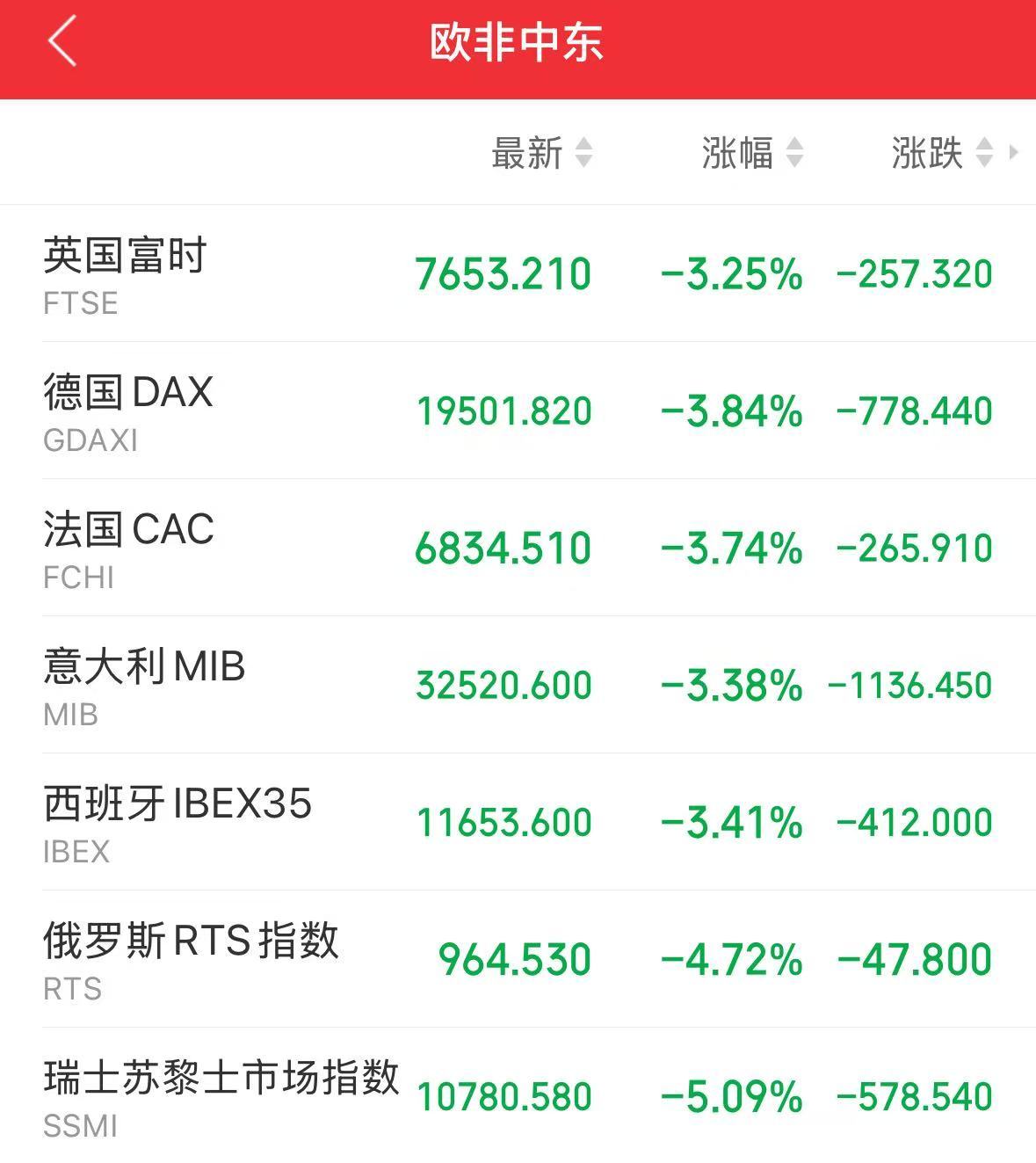 欧股快速下挫,斯托克欧洲600指数跌4%,至467.21点。法国CAC指数下跌3.74%,,德国DAX指数日内跌超3.8%,英国富时指数大跌3.25%.