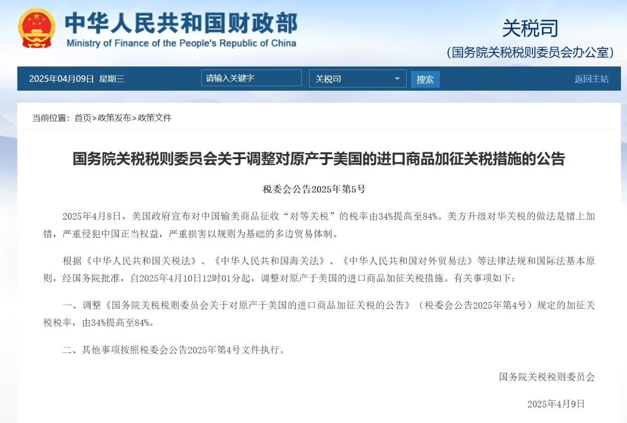 一、调整《国务院关税税则委员会关于对原产于美国的进口商品加征关税的公告》(税委会公告2025年第4号)规定的加征关税税率,由34%提高至84%。